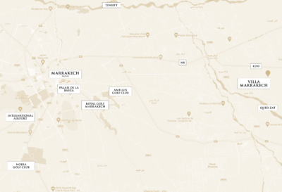 DIE VILLA MARRAKECH LIEGT 22 KM ÖSTLICH VON MARRAKESCH, AN DER STRASSE NACH FES. DAS OBJEKT ERSTRECKT SICH AUF EINER FLÄCHE VON CA. 10.000 QMx, DEN FLUGHAFEN ERREICHEN SIE IN CA. 30 MINUTEN, DAS ZENTRUM VON MARRAKESCH IN CA. 25 MINUTEN.